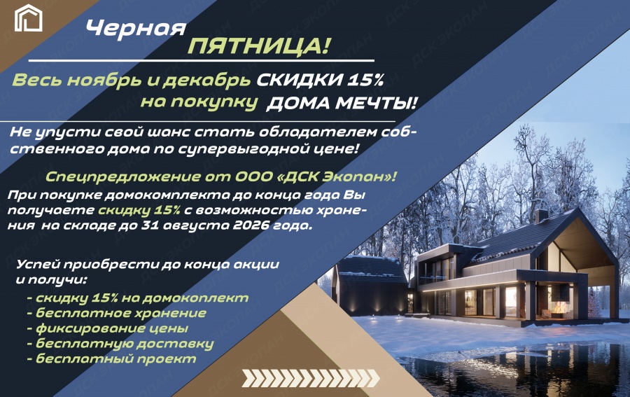 Специальное предложение от компании «ДСК ЭКОПАН»! При покупке домокомплекта, вы получаете скидку -15%. В период проведения акции фиксируйте стоимость на 2026 год, оплата всего от 50% от стоимости — заключайте договор сейчас, а оплачивайте остаток с началом строительства. Все последующие повышения цены вас не коснуться. Торопитесь построить свой дом с существенной экономией!